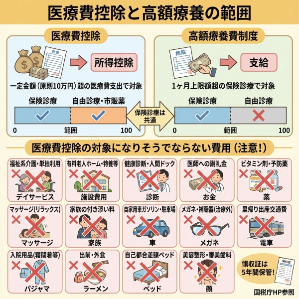 一方、医療費控除の対象については、保険診療だけでなく常識的な自由診療や薬局での医薬品の購入なども含まれるのです。