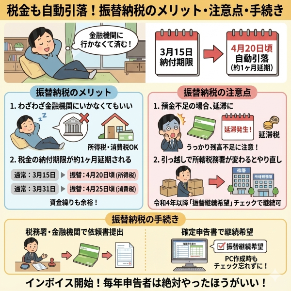 結論から言えば、毎年確定申告で所得税を納税する人であれば、振替納税は絶対にしたほうが良いのですが、今回はその振替納税のメリットと注意点についてまとめておきます。