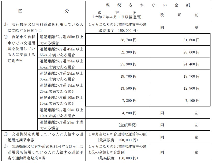 交通用具を使用している人の非課税限度額は、片道の通勤距離に応じて段階的に引き上げられました。特に長距離通勤者ほど、引き上げ幅が大きくなっています。