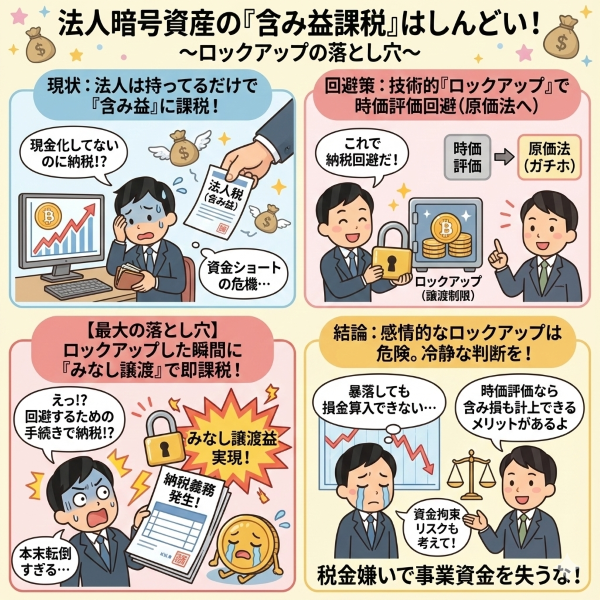 要するに、法人で暗号資産を保有する場合、まだ現金化していないにもかかわらず、決算日のレートが高騰していれば、その「含み益」に対して約35%の法人税等が課されるのです。