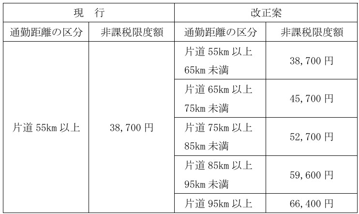 ・片道65Km以上の通勤交通費の非課税限度額を以下のように引き上げる