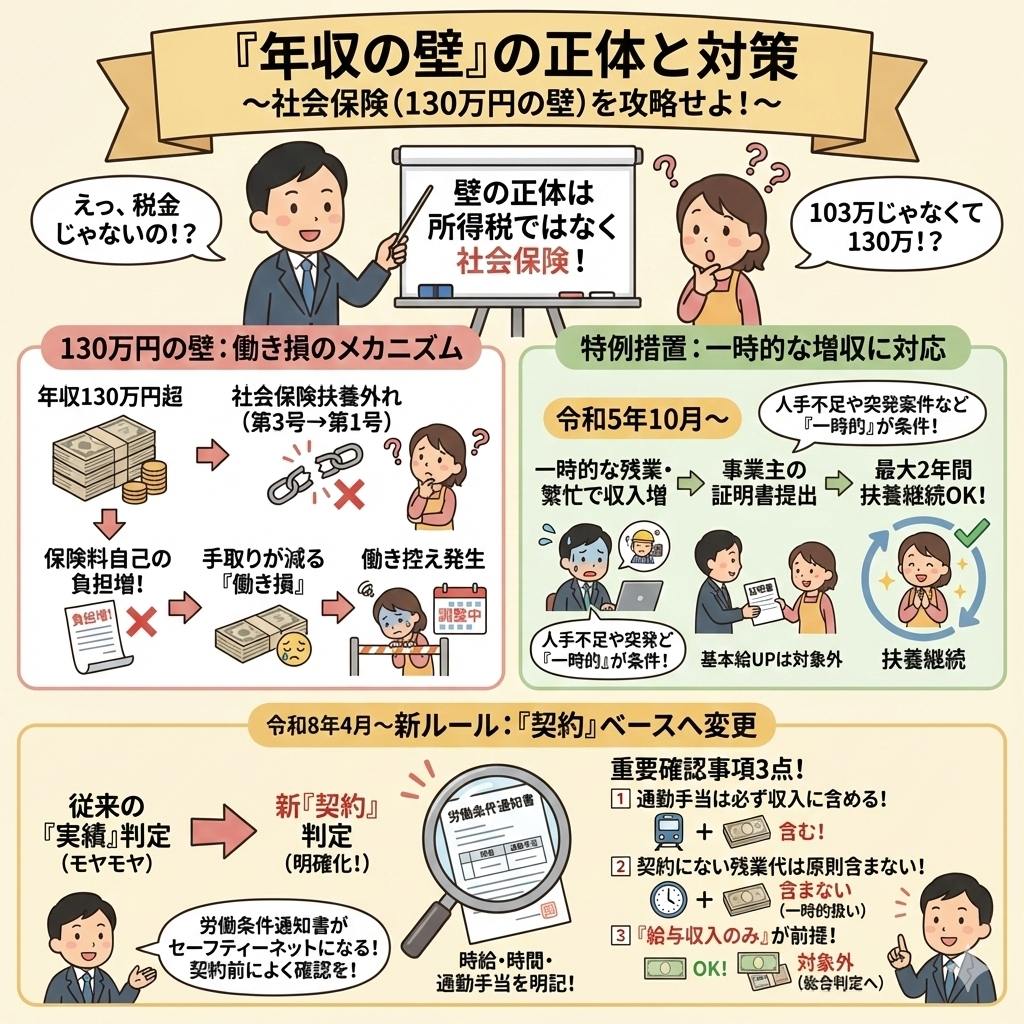 そこで、今回は、たまたま130万円を超えてしまった時の対処法と、令和8年4月から導入される新しい扶養認定ルールについて、まとめてみようと思います。