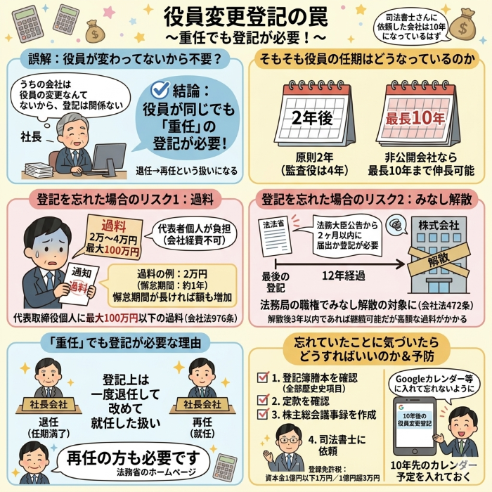 法務省も、公式サイトで「役員の変更の登記を忘れていませんか? 再任の方も必要です」と注意喚起をしているほどです。
